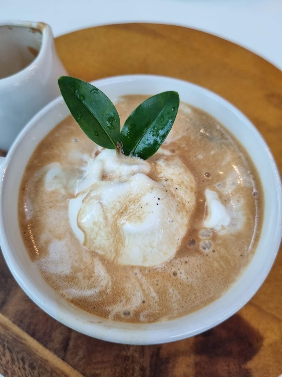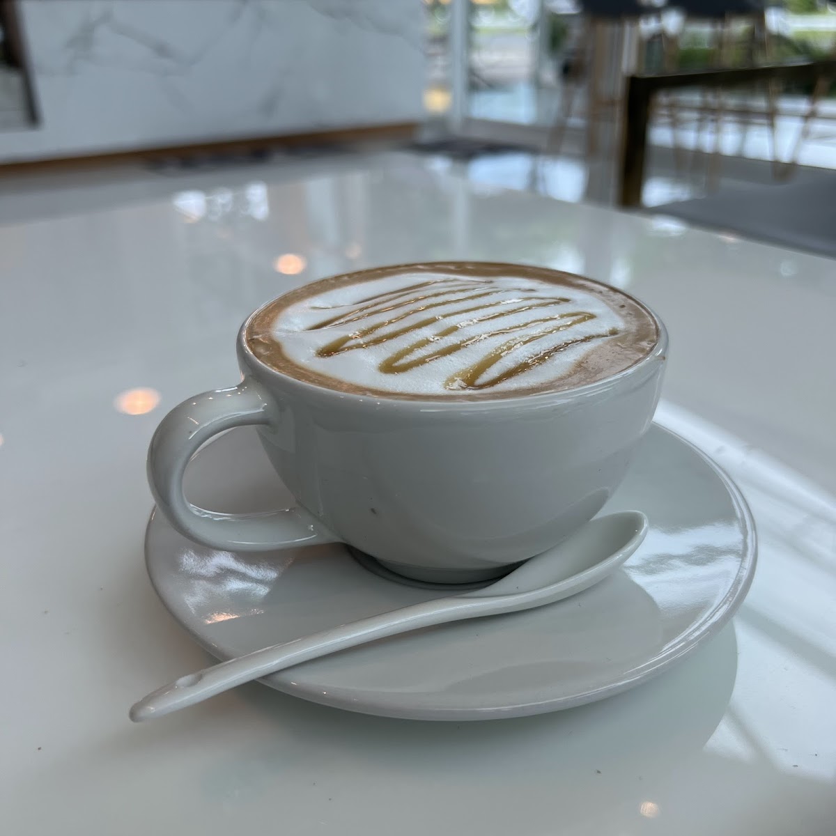 As you approach, the ambiance becomes apparent—an inviting atmosphere enhanced by the gentle rustle of leaves and the delightful aroma of freshly brewed coffee wafting through the air. Inside, the aesthetic strikes a perfect balance between modern elegance and cozy comfort, with marble-patterned walls and chic cream furniture that create a soothing escape from the everyday hustle.